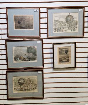 19th century English school Engraving Five ballooning engravings to include - 'Descent of Mr Green's Balloon, On Pirbright Common, Near Guildford', hand coloured,15cm x 23cm, 'Juvenile Fete and Balloon Race at Cremorne Gardens', hand coloured, 'Ascent of Mr Hampton's "Erin-go-Bragh" Balloon at Batty's Royal Hippodrome Kensington', hand coloured, all for The Illustrated London News, 1850's and two further (5)