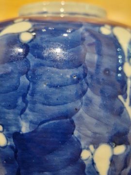 Two Chinese Qing Dynasty vases and covers, the first of inverted baluster form with dog of Fo finial, painted with birds, flowering and fruiting trees in blue, on a crackle-glazed ground within bronzed incised borders, impressed and incised seal mark to base, 21.2cm high, the other of ginger jar form, decorated with flowering prunus, four-character mark to base (2)  Condition Report Vase with light surface marks, accretions, cover has schips to the edge, chip and repair to the dog finial, small chip near the base.Ginger jar with light surface marks and accretions. Good overall condition.  Both with general wear and tear.