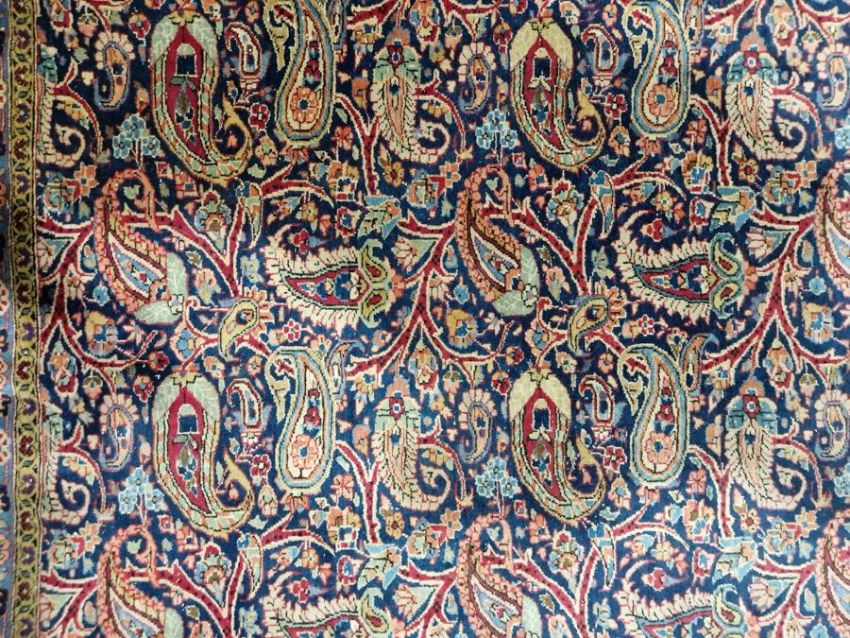 Persian blue ground handmade wool, cotton and silk 'Kashan' rug with floral and boteh design field, multiple floral borders, 270cm x 180cm