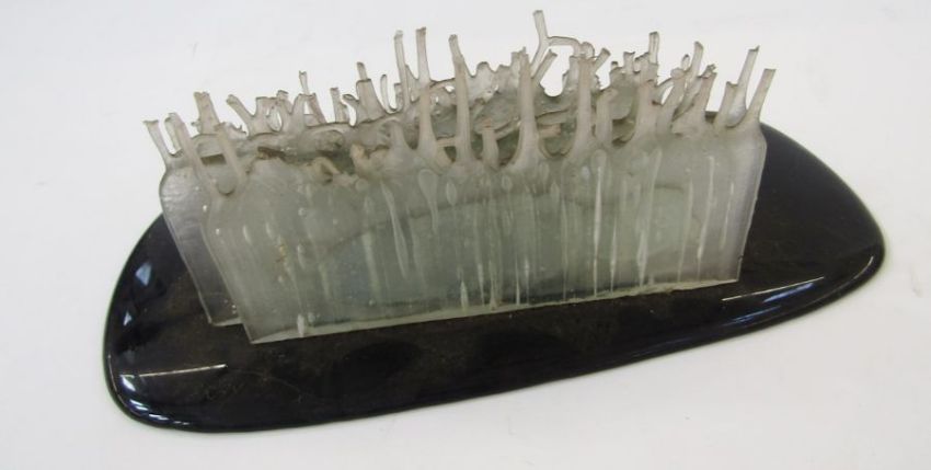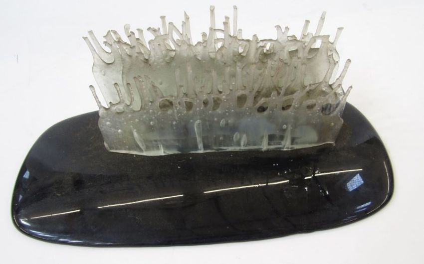 Charles Bray (1922-2012), a glass stalagmite formed sculpture, circa 1980-90, on a black opaque glass shaped rectangular base, etched BRAY to base (cracked to base), 36cm wide