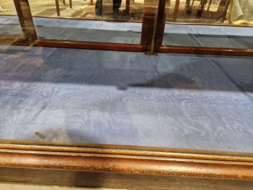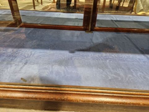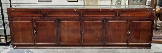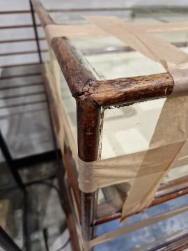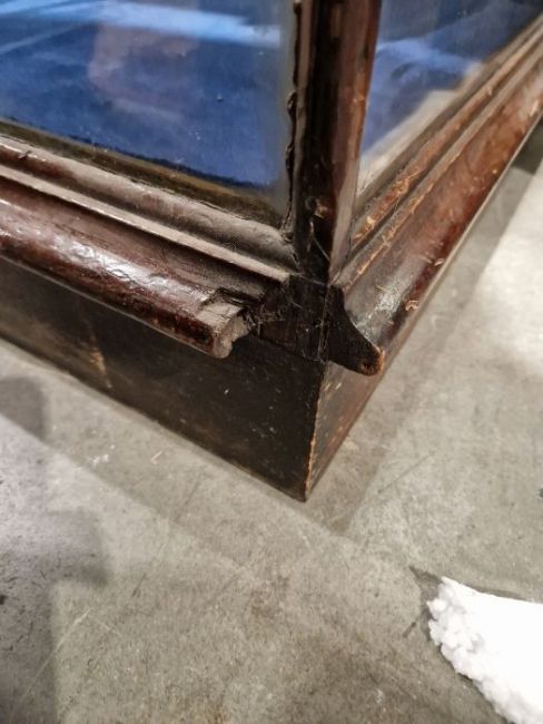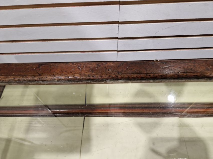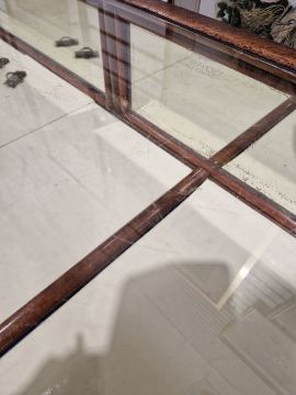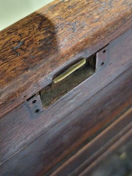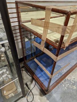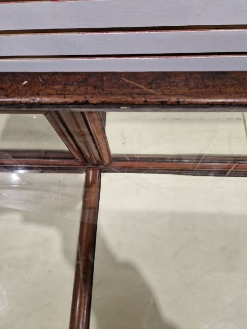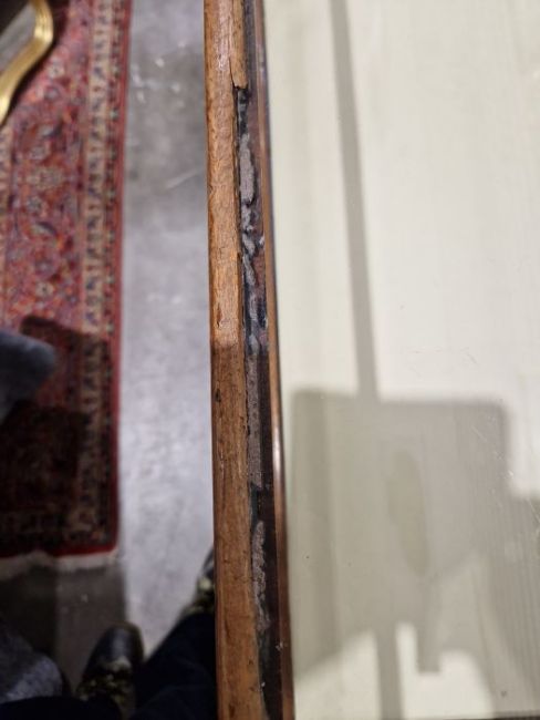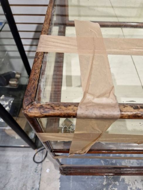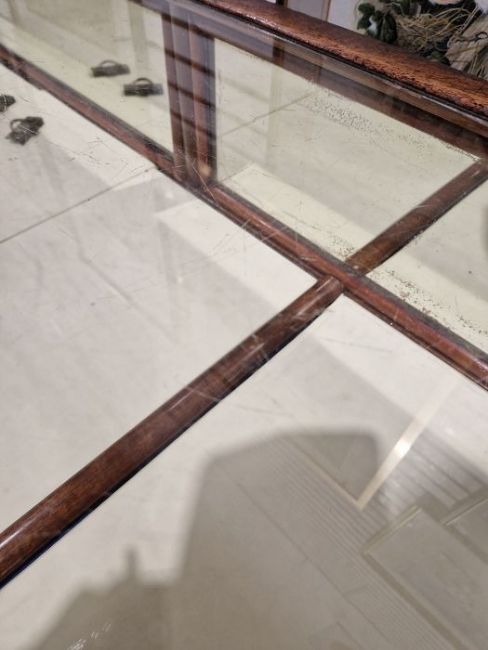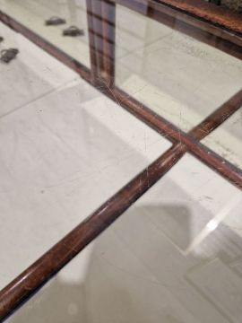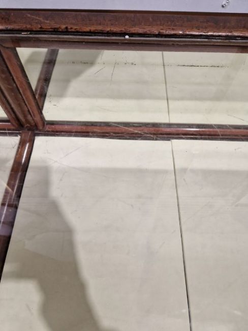 Surface scratches to both wood and glass. Wood with scuffs and knocks. Areas of loss to sections of wood, some splits. slight damage to one corner, three handles missing from mirrored drop down drawers. General wear and tear