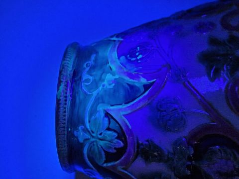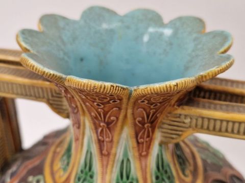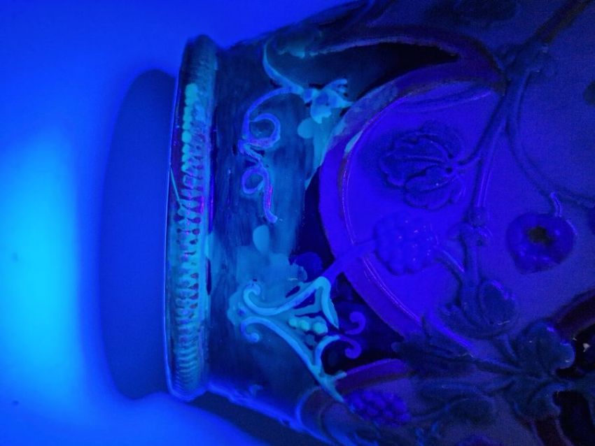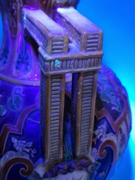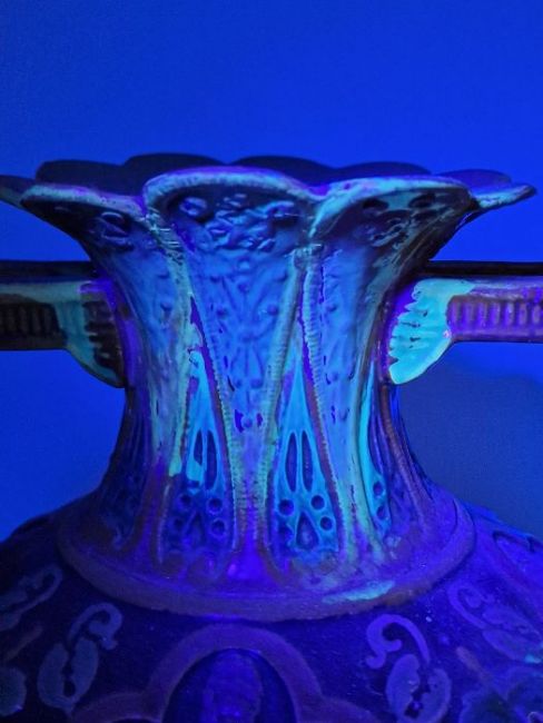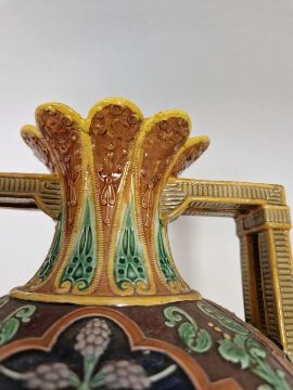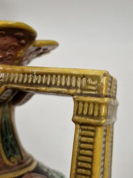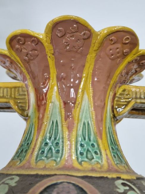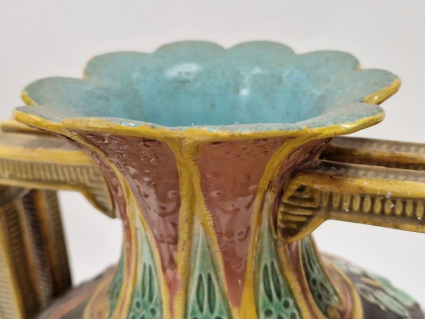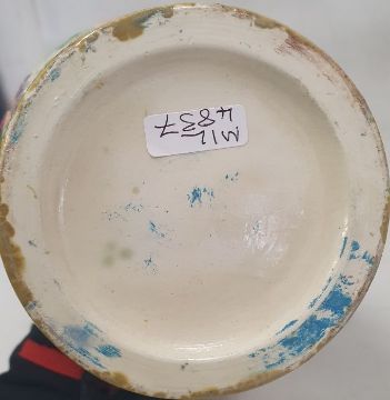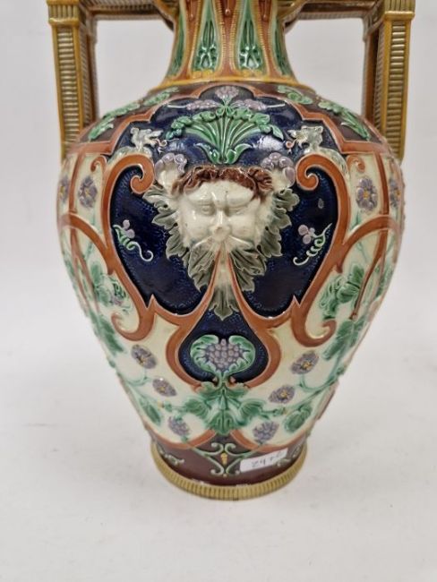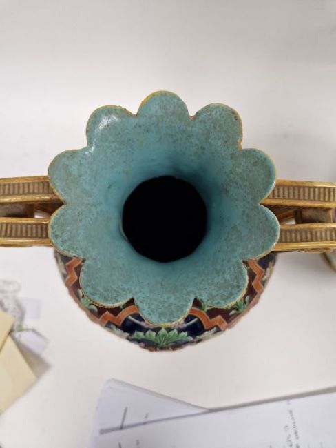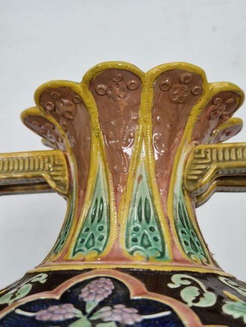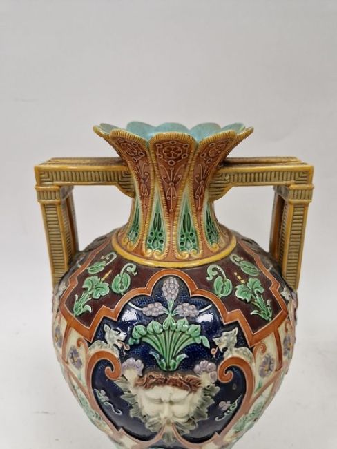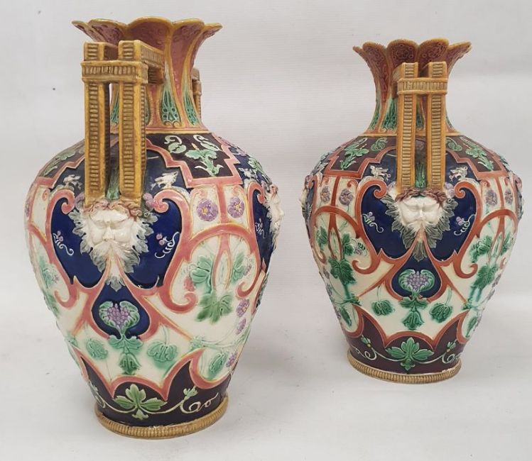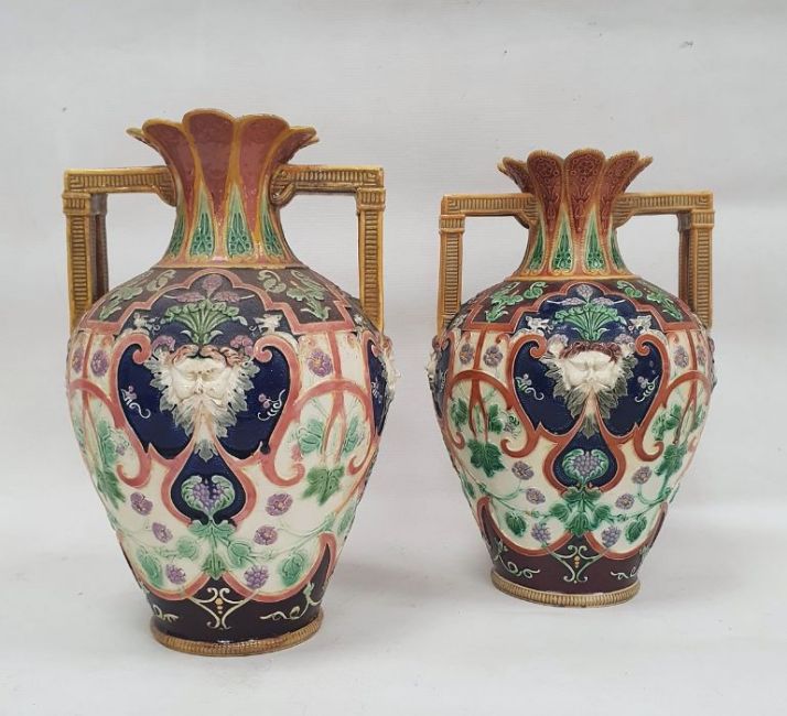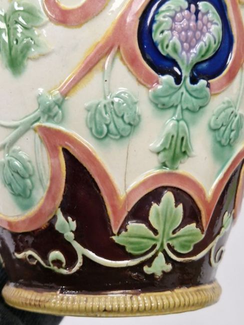 Light surface marks and accretions. Overpainting and repairs to both, mainly to the neck, rim and handles. One with hairline to body. General wear and tear.