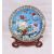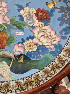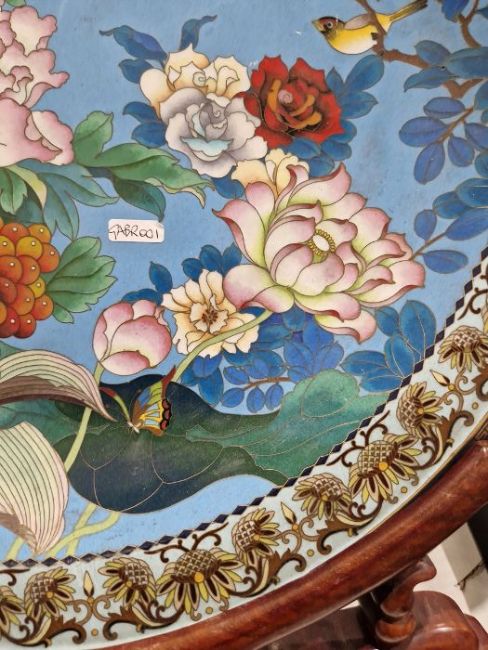 20th century Chinese large cloisonne charger and hardwood stand, decorated with flowering peony, roses and other flowers, birds in flight and sets of insects, reserved on a pale blue ground within a sunflower-pattern border, on a carved ruyi-shaped scroll stand, 52cm diameter
