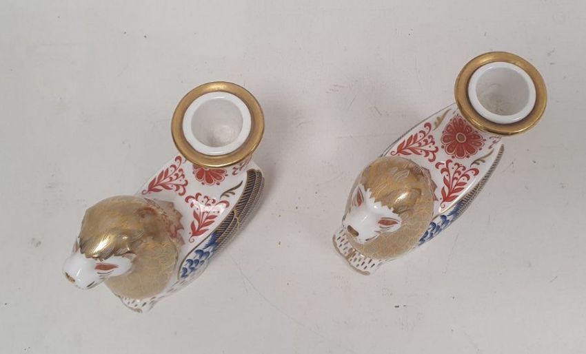 Pair of Royal Crown Derby bone china imari pattern mythical beast candlesticks, each modelled as a winged lion with flared sconce, printed iron red marks and painters marks, 8.5cm high (2)