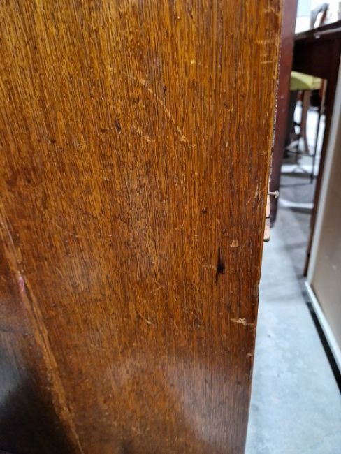 Surface scratches, scuffs and knocks to the wood. Areas of fading, discolouration and stains. Handle missing from interior central drawer, area of loss to left interior arch. Area of loss to ebonised beading on one drawer. Wear and fading to cloth. Handles appear to have been replaced. General wear and tear.