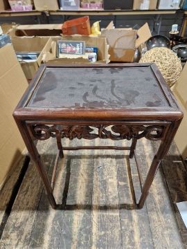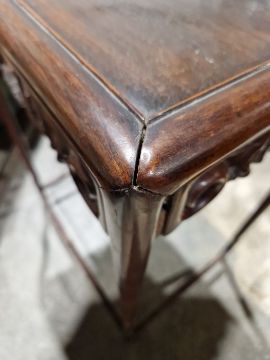 Surface scratches, scuffs and knocks. Areas of fading and minor stains. Largest table has damage to one corner where it has separated, there is an area of loss to the top at the same corner. Other tables with slightly loose joints, some of the carved friezes are loose. General wear and tear.