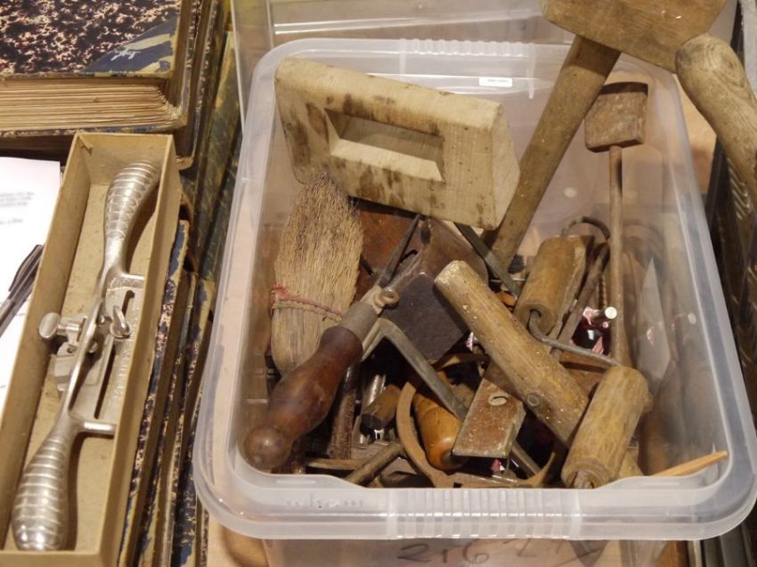 Quantity of vintage tools to include mallets, wooden calipers, plain, large chisel, etc (2 boxes)