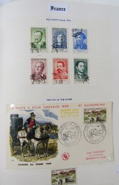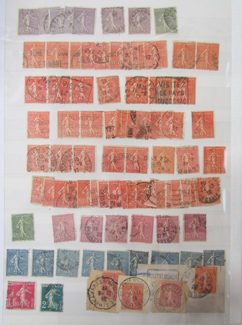 France stamps: box of 8 albums/stock-books from imperforate issues to modern day, mint and used definitives, commemoratives, postage due and others with 100s of covers (including first day) and postcards covering the postal history and life of France including artists series, much cat value and individual stamps such as mint 1Fr SG 239 cat £225 noted, 1000s.