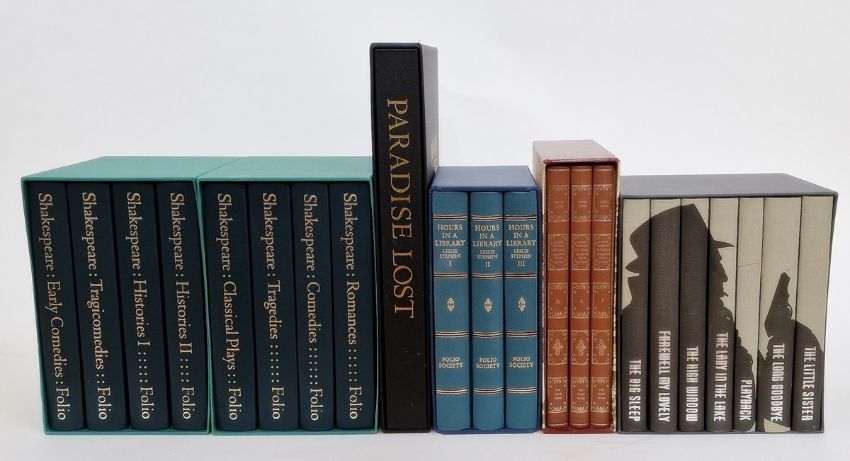 Folio society  Paradise Lost, folio, with slip case, 6 vols, two box sets Shakespeare - Works Raymond Chandler The Complete Novels, boxed set Steven, Leslie "Hours in the Library", 3 vols, boxed set  Daniel Defoe  "A Tour Through the Island of Great Britain", 3 vols, boxed set