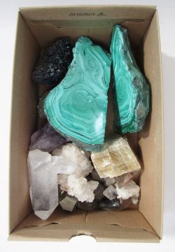 Collection of fossils and stones to include two section of malachite, quartz, fools gold, etc