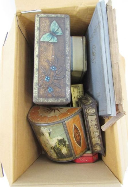 Quantity decorative tins including Rowntree & Co, Carr & Co, Army Club, Jacob & Co butterfly decorated, OXO and Crawfords Biscuits 1939 folding desk blotter