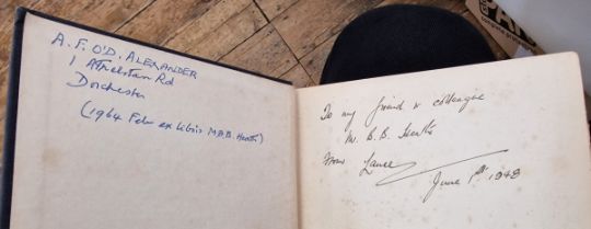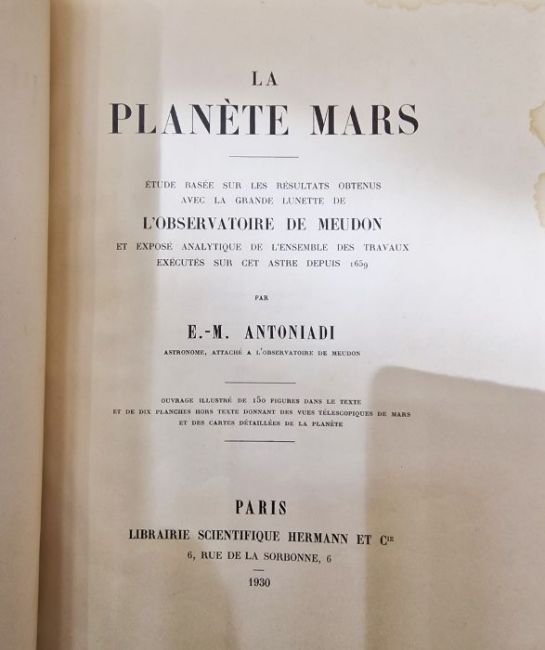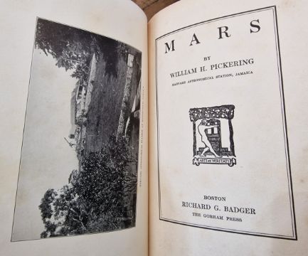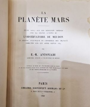 Astronomy Lowell, Percival "Mars", Longmans Green & Co 1896, 2nd edition, ink name top of tp, frontis with tissue guard, plate 24 is a double page map of Mars from the Lowell Observatory Flagstaff 1895, red cloth which has got stains and damp, gilt pictorial front board, gilt titles "Mars and its Canals", the Macmillan Company 1907, photographic frontis of Mars hill, double page plan of Mars, numerous plates and illustrations, hinges cracked, inked name inside front board, green cloth, gilt titles, some staining Pickering, William H. "Mars", the Harvard Astronomical Station, Jamaica, published Richard G Badger, Gorham Press, Boston, 1921, photographic frontis, photographic plates and other plates, some light foxing throughout, names and inscriptions inside front board and ffep, blue cloth blindstamped  Flammarion, Camille "La Planete Mars ...", 2 vols, Paris, Gauthier-Villars 1892, vol 2 dated 1909, numerous illustrations throughout, small folio, blue cloth, inked name inside front board of both volumes, blue cloth with black titles, vol 2 backstrip beginning to split from the top  Antoniadi, E M "La Planete Mars ...", L'Observatoire du Meudon, Paris, 1930, some water stains to the edges of initial pages, illustrations throughout, blue cloth, ink name inside front board, front board water damaged, backstrip faded De Vaucouleurs, Gerard de "The Planet Mars", translated from the French by Patrick A Moore, Faber & Faber Ltd, 1950, bearing a compliment slip for Messrs Faber and Faber with compliments of the author, not signed, orange cloth, dj has seen water damage (7)