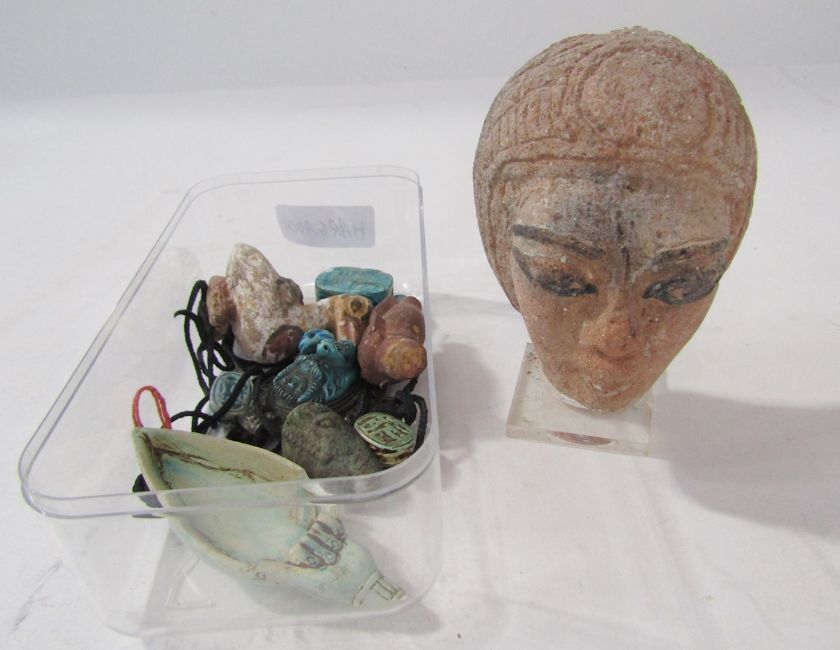 Collection of items relating to antiquity to include an Egyptian head mounted on a stand, a collection of scarab beetles, a painted duck, etc