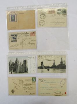 Exhibition postal history: stamp album with 55 postally-used postcards from various international expositions, exhibitions and fairs in Europe and Americas from early 20th century period, many with special-to-event cancellations, promotional Cinderellas and labels. Inspector marks and postage due seen.