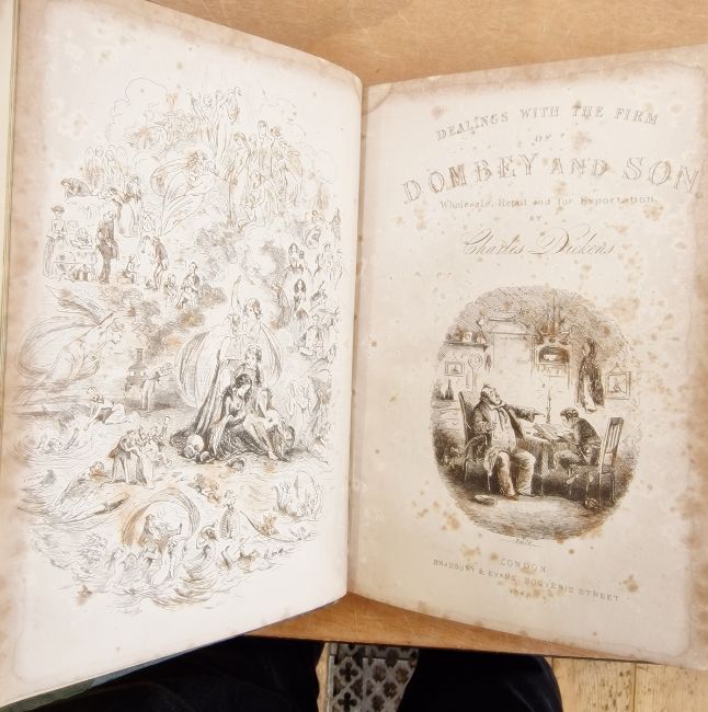 Dickens, Charles  "Bleak House", Bradbury & Evans Bouverie Street 1853, frontis, vignette on tp, illustrations by H K Browne, foxing to the edges and to frontis and tp, offsetting to ffep, inked name in biro December, 51, grey boards with linen backstrip which is splitting and faded pastedown title, all edges speckled, hinges cracked  "David Copperfield", Bradbury & Evans 1850, illustrations by H K Browne, vignette on tp, frontis badly foxed, plates with stains and foxing to edges, misprint on page 132 'screwed' instead of 'screamed', original publishers cloth boards with blindstamped decoration, gilt titles to backstrip, backstrip splitting and with some loss at the top, all corners bumped "Dealings with the Firm of Dombey & Son", Bradbury & Evans 1848, illustrations by H K Browne, frontis and vignette on tp, badly stained, staining to all plates, some sellotape repairs, contemporary marbled boards, quarter leather but loss and rubbing, a single vol of Dombey & Son of 2 1848  "The Pickwick Club", The Caxton Publishing Company, colour frontis, colour plates and other illustrations by Seymour & Phiz, rebound quarter leather with pastedown titles to the backstrip and raised bands  "Little Dorritt", Bradbury & Evans 1857, front hinge cracked, binding and text pages loose, illustrations by H K Browne, contemporary marbled boards, has been rebacked and the contemporary leather backstrip laid down but part missing, marbled edges (6)