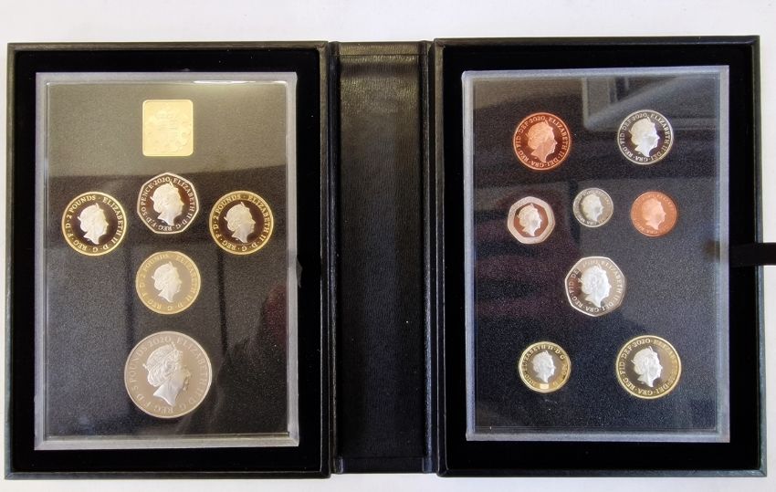 UK proof set, 2020 proof 13 coin year set with certificate of authenticity £5 down to 1p, including the £5 200th anniversary of the death of George III, the Agatha Christie, 75th anniversary of VE Day and the 400th anniversary of the Mayflower £2 coins.
