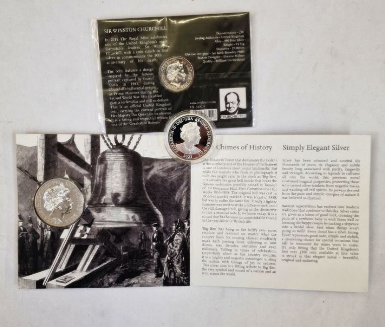 UK silver coins, Big Ben £100, 2015 Sir Winston Churchill £20 and Alderney 2022 £5