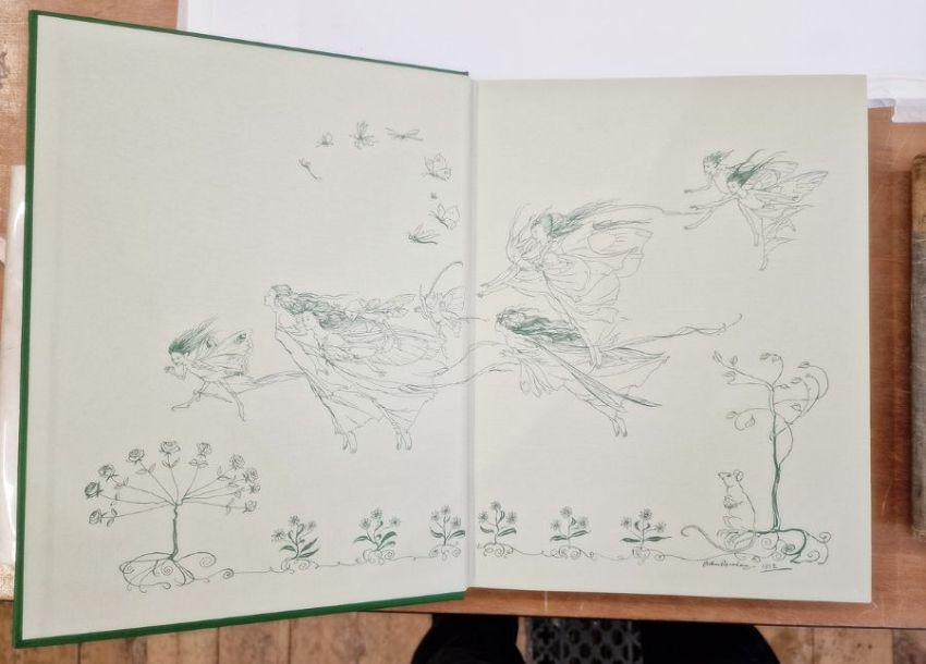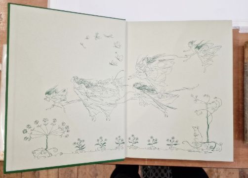 Folio society  Arthur Rackham (ills)  "Peter Pan in Kensington Gardens", JM Barry, folio society 2004, decorated ep, colour plates, illustrations, colour plates are tipped in, large folio, green cloth, gilt decorations and titles, green slip case which has some shelfware Barry, J M  "Peter Pan in Kensington Gardens", with drawings by Arthur Rackham, Hodder & Stoughton (n.d.), colour frontis with tissue guard, foxing on the tp, colour plates, green pictorial ep, name written on lower part of ffep, green cloth with pictorial gilt decoration to front board and gilt titles to backstrip, glassine cover  "Fables de la Fontaine", Paris, Librairie Garnier Freres, the series 'Albums Illustres Pour Enfants', colour plates and other ills, pictorial boards "Vieilles Chansons et Rondes Pour les Petits Enfants", 2 vols  "Mon Village ...", Par L'Oncle Hansi, all three oblong folio (8)