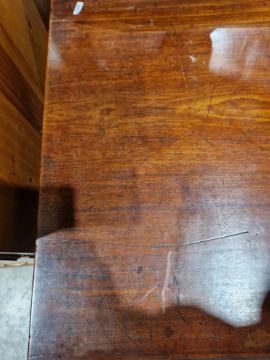 Surface scratches, scuffs and knocks, areas of fading and discolouration, some stains to the top. Appears to be a repair to two legs, escutcheons have been removed, Repair to the corner of one drop leaf. General wear and tear.