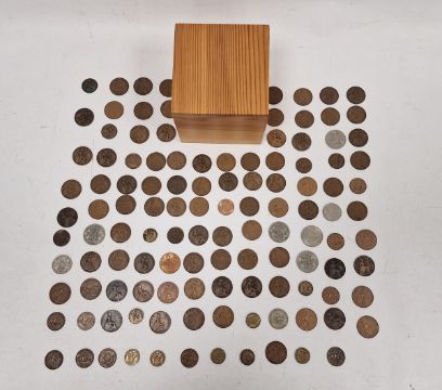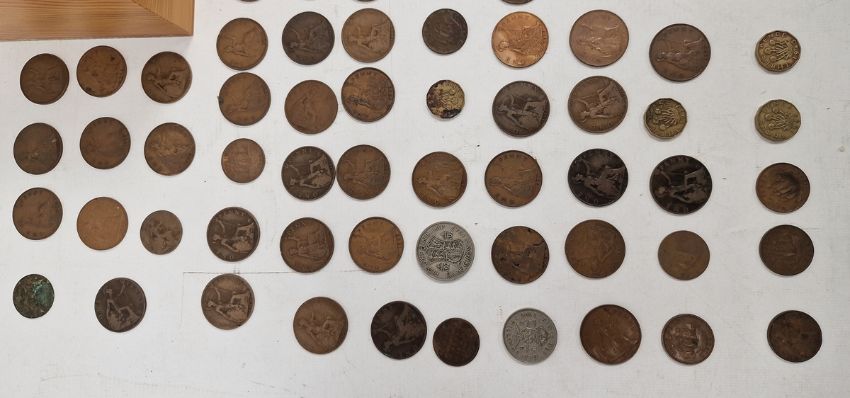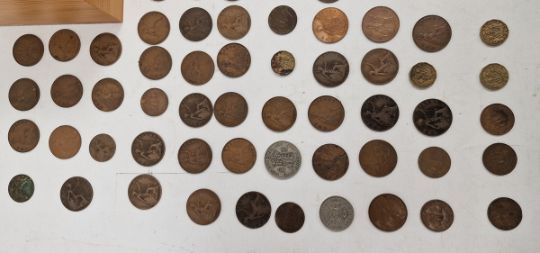 Box of early 20th century British coinage, predominantly 1930's-50's George VI one pennies