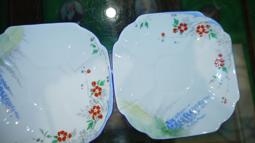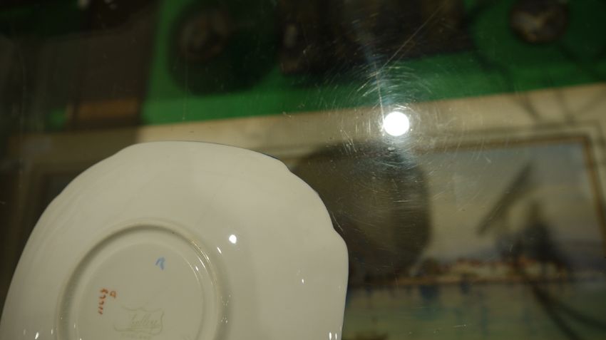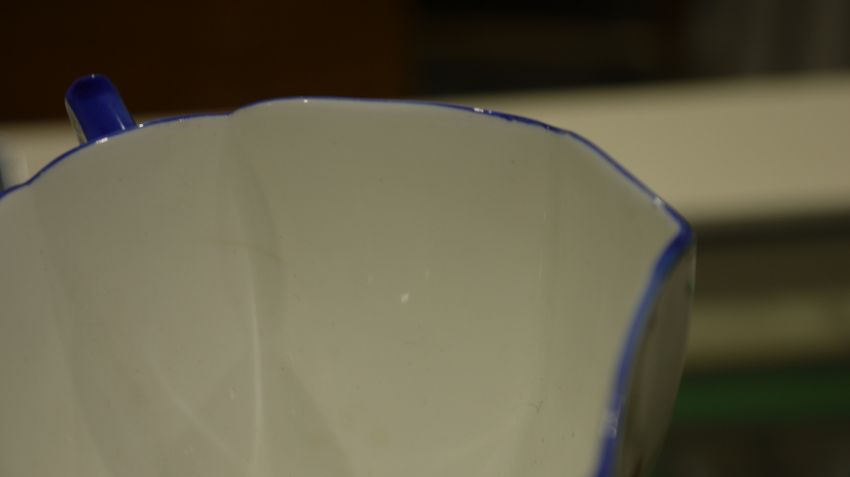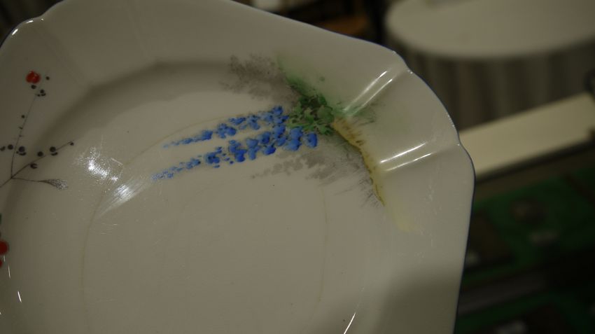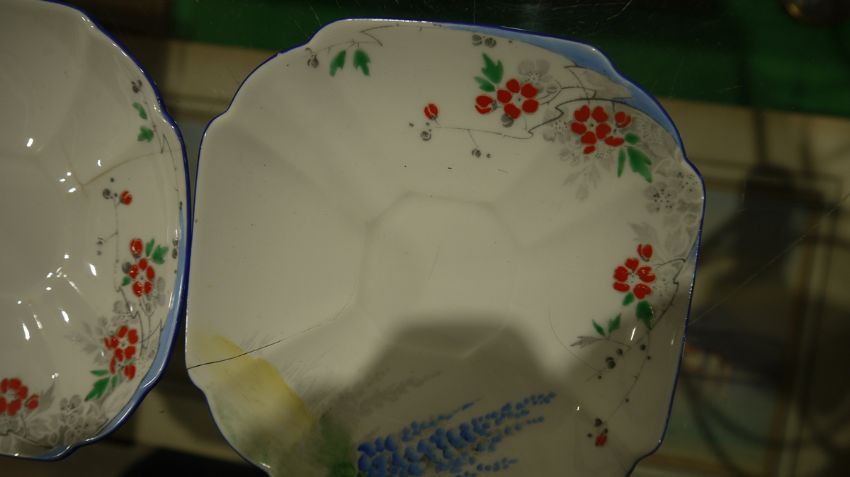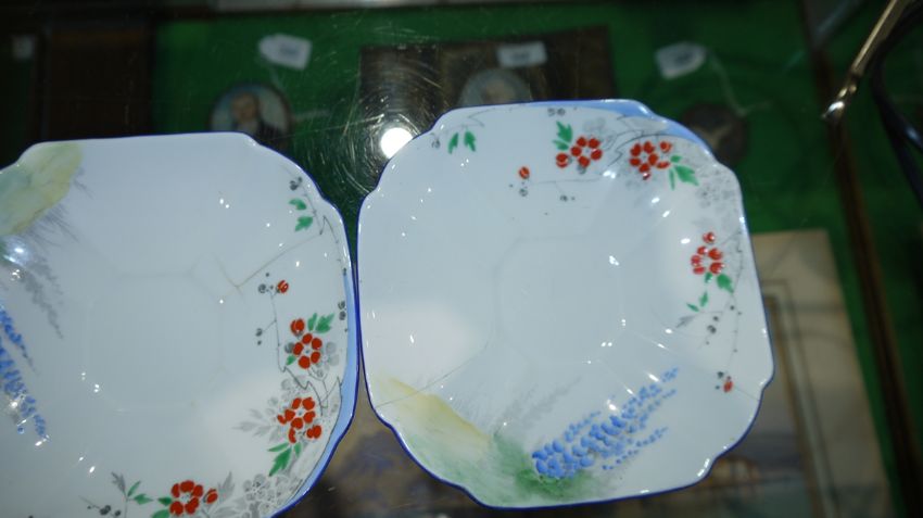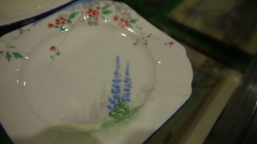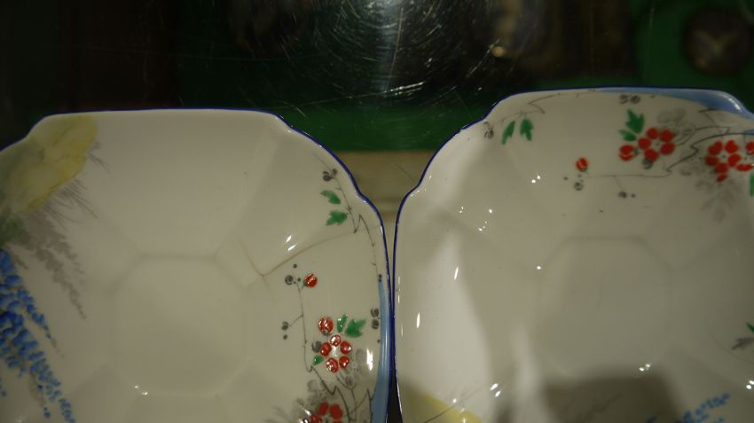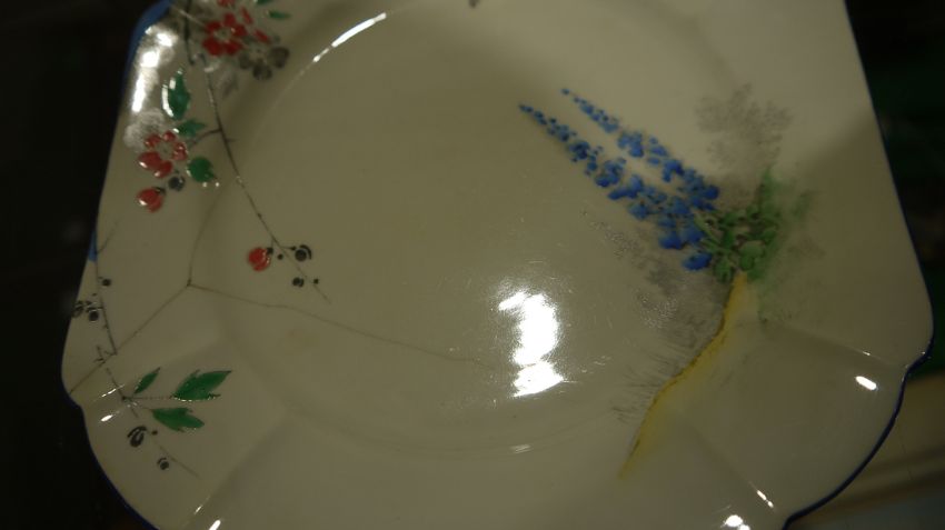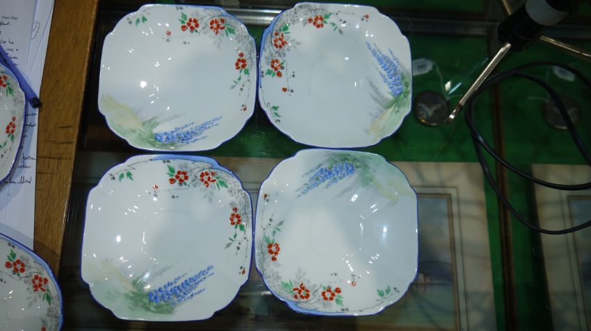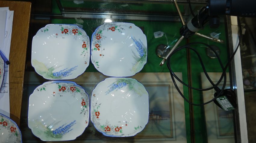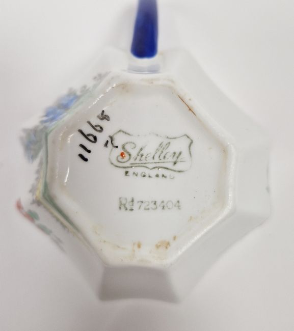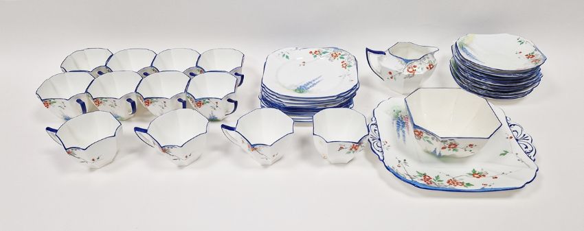 Shelley Queen Anne pattern Art Deco part tea service, printed and painted with the Lupin pattern, printed green marks, registration no. RD7234, comprising a milk jug, a sugar bowl, a two-handled cake plate, 12 teacups, 11 saucers and 11 side plates  Condition Report Some crazing and use related wear throughout.- Teacups - Four cups have hairline cracks. One furth has a large hairline crack to the lower section. Another has a pre-glazing dent/chip. One has a broken handle (pieces still present).-  Milk Jug - Some pattern wear.- Sugar bowl - Hairline crack. Some pattern wear.- Saucers - Some pattern wear throughout. Four with hairline cracks. Two with significant cracks.- Side plates - Two with large hairline cracks. One with significant cracks. And another repaired, glued at large crack through centre of plate.Please see additonal photos.