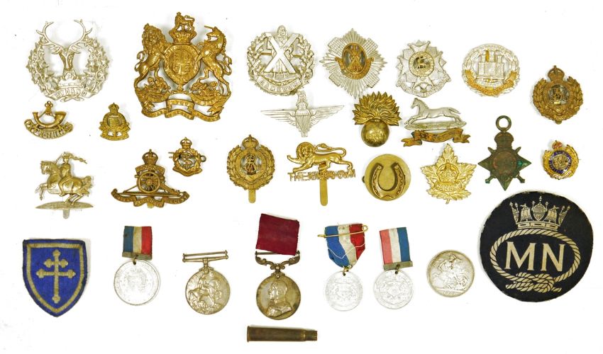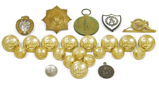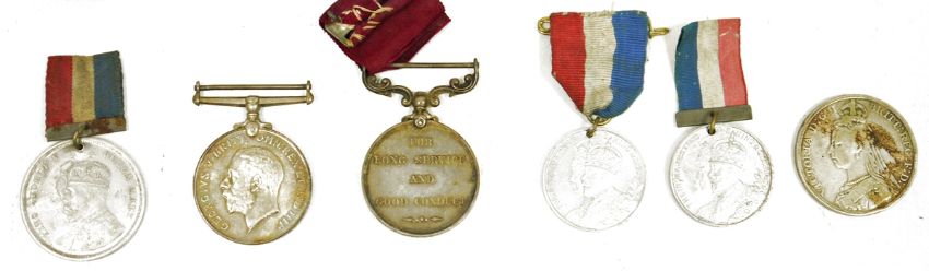 Collection of naval gilt-brass buttons, assorted regimental badges, medals and ephemera to include three George V coronation medals, a George V Long service and Good Conduct medal and a George V war medal, named for SPR CJ Stacey, no.28091, a Victorian silver crown 1889 and assorted Seaman's record books, Certificate of Discharge and other paper records relating to the naval career of W. F. Drew
