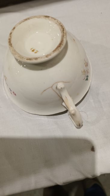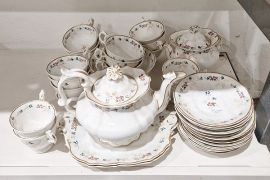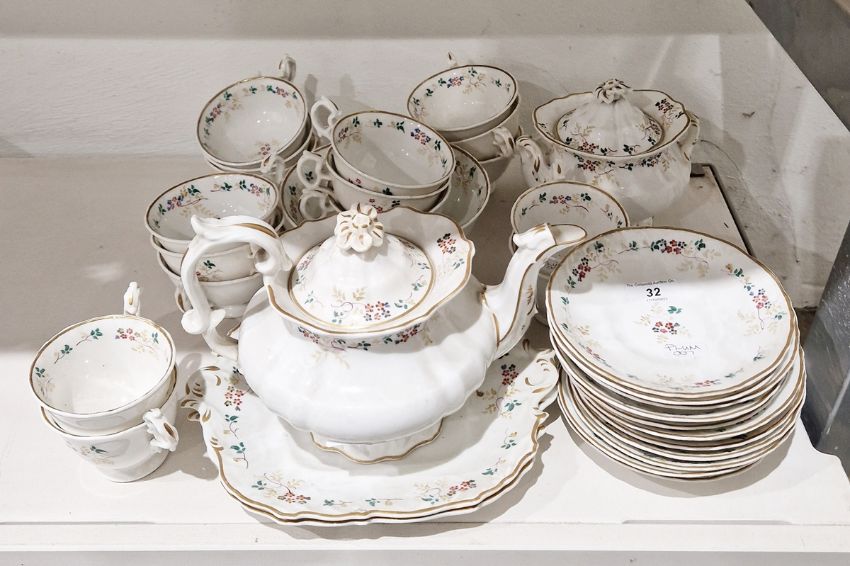 English porcelain part tea service, circa 1835, painted with sprigs of flowers and leafy tendrils within shaped gilt rims, comprising a teapot and cover, two rocaille moulded cake plates, a two-handled sugar bowl and cover, a slop bowl, four coffee cups, 12 teacups and 12 saucers  Condition Report The teapot appears to have no obvious faults , other than the result of age and being in a cupboard for years.  One teacup is cracked, please see image.surface wear to cake plates and teaplates, overall condition fair. Just needs a good wash.