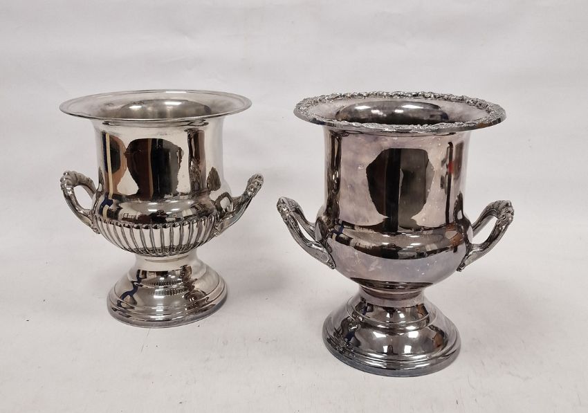 Two 20th century silver-plated urn-shaped champagne coolers, one with label for 'Ranleigh', each two-handled example with scroll moulded handles, raised on domed stepped base, 26.5cm high max. (2)