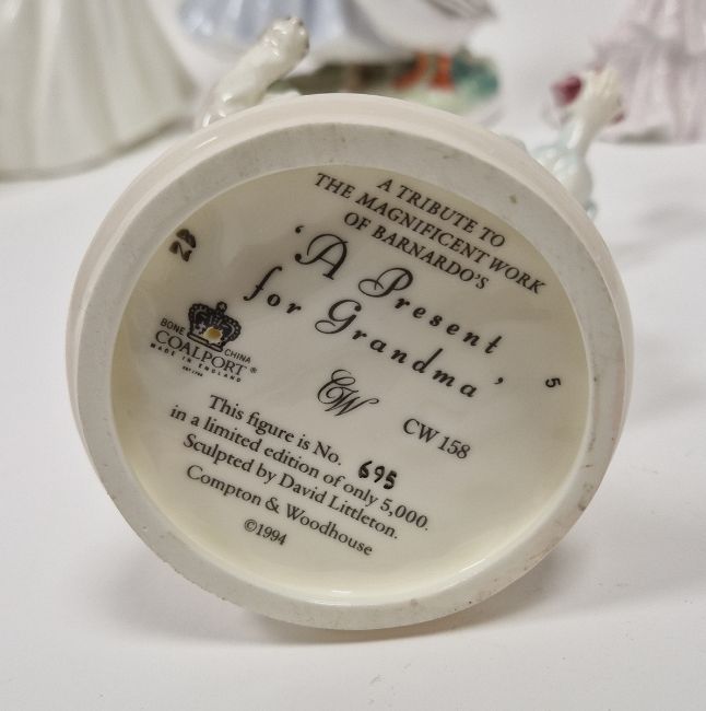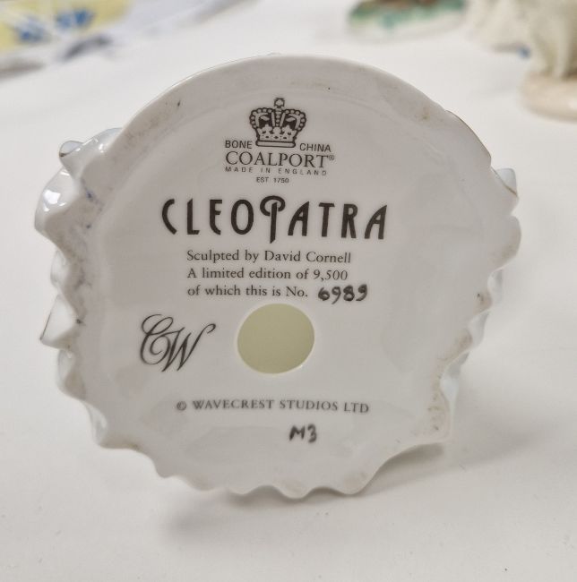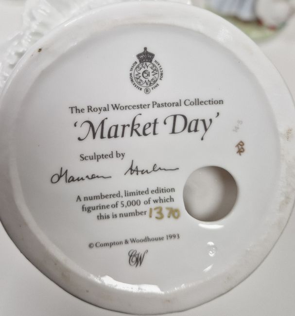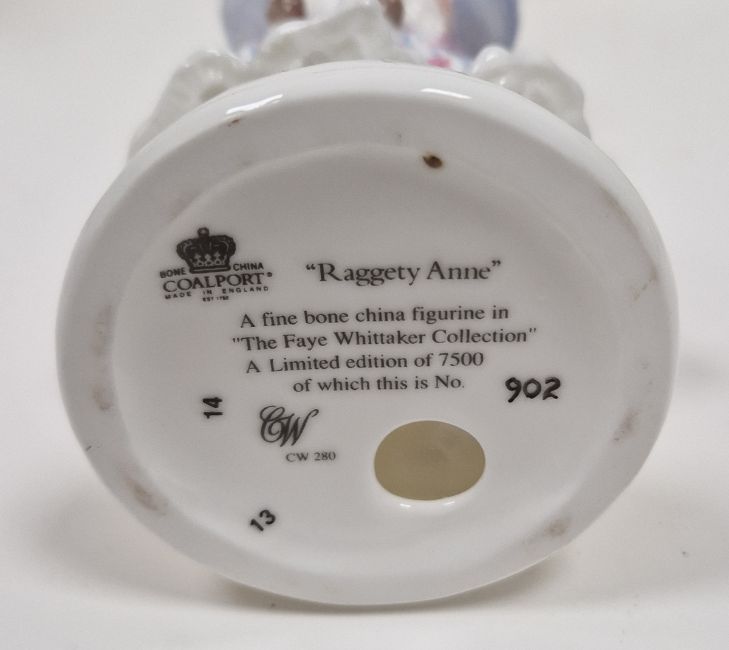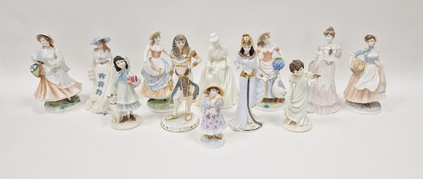 Collection of Royal Worcester, Coalport and Wedgwood limited edition figures, 20th century, various printed marks, including Wedgwood figures of Tutankhamun the Boy King circa 1996, limited edition no.6500/9500, and Cleopatra modelled by David Cornell, limited edition no.6989/9500, the Royal Worcester Pastoral Collection 'Fruit Picking', limited edition no.1370/5000, and 'Goose Girl', no.1370/5000, 'Baker's Wife', 1370/5000 and 'Market Day', 1370/5000, Coalport 'A Present for Grandma', no.695/5000, and others (12) (with seven wooden stands)  Condition Report Market day - Small chip to rear of dress.Emma Hamilton - Chip to rear of dress.Raggedy Anne - Some missed paint to face and sleeve.Tutankhamun - Glue holding staff has broken.Some pattern wear and minor moulding imperfections throughout.