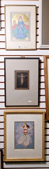 Kathleen M Day Watercolour drawing with gold "St Elizabeth of Hungary", 20.5cm x 15cm  Black and white print and an Indian painting of a dancer (3)