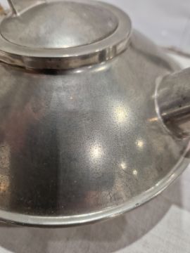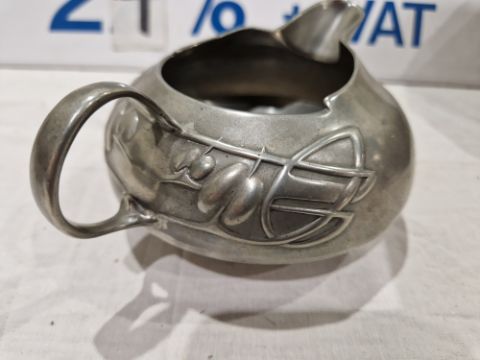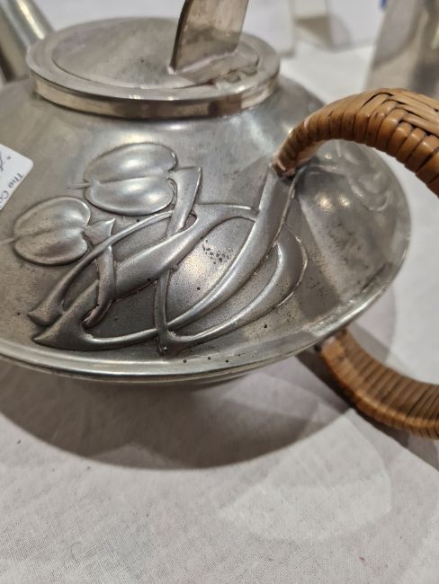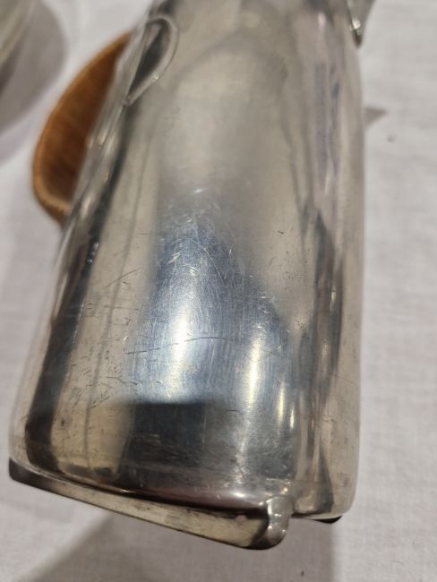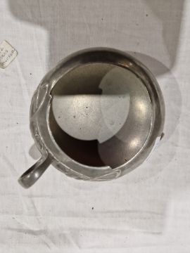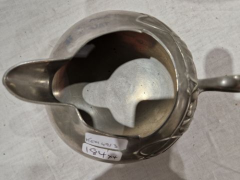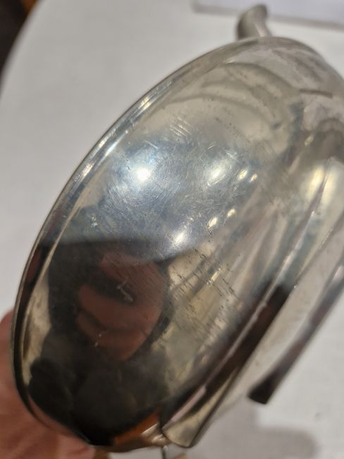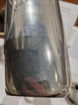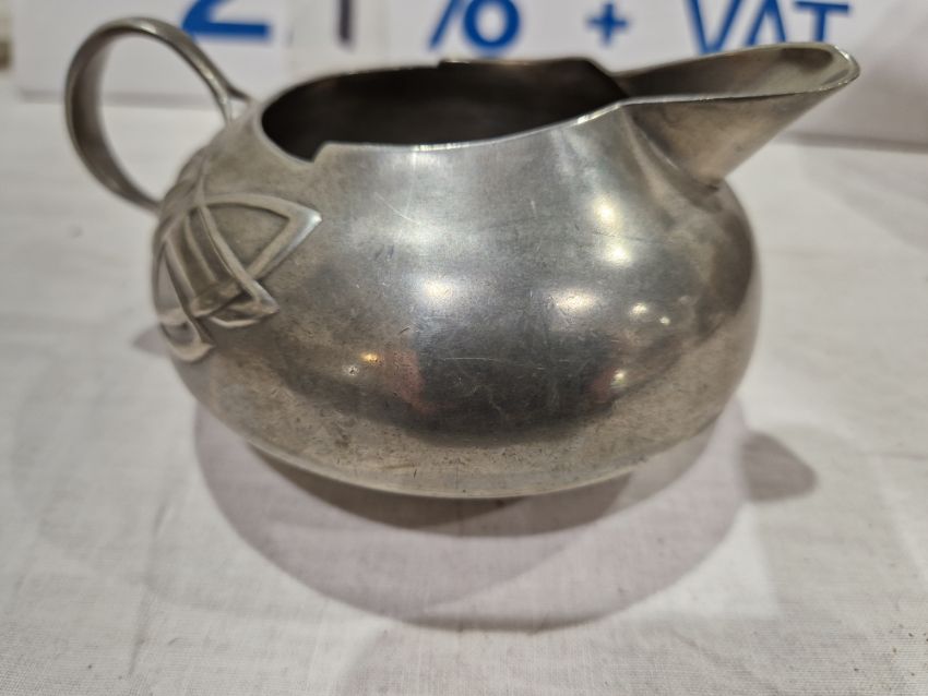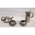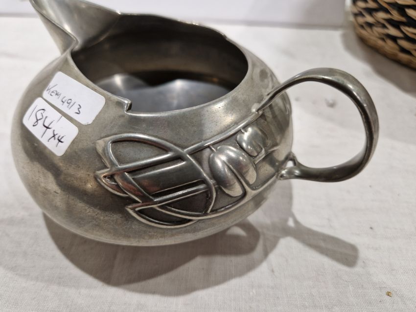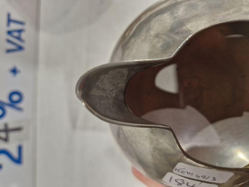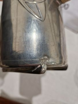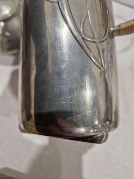 All with light surface scratches and marks. Appears to be a solder mark or repair to the foot of the water jug. Cream jug with dent to the lip. General wear and tear to all.