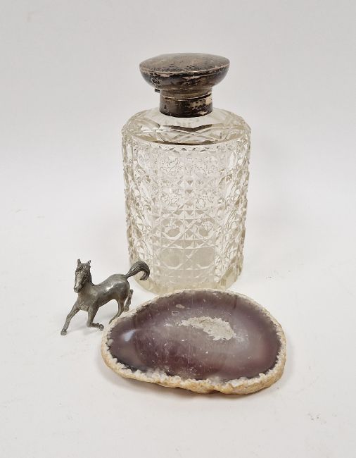 Edwardian silver-mounted scent bottle having circular flattened stopper to the cylindrical cut body, Birmingham 1912, a small white metal horse and a slice of agate