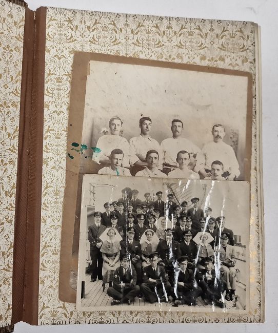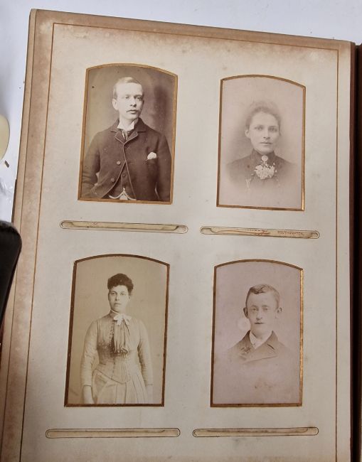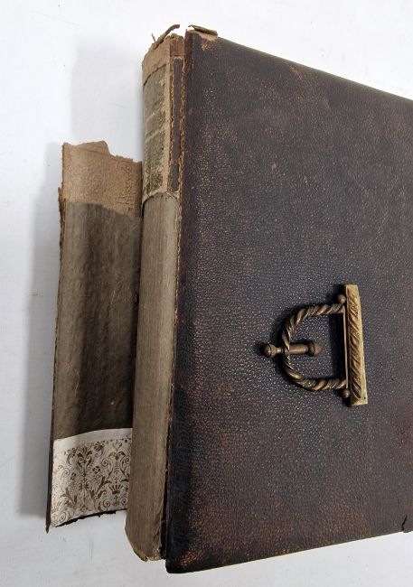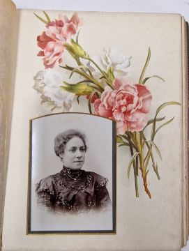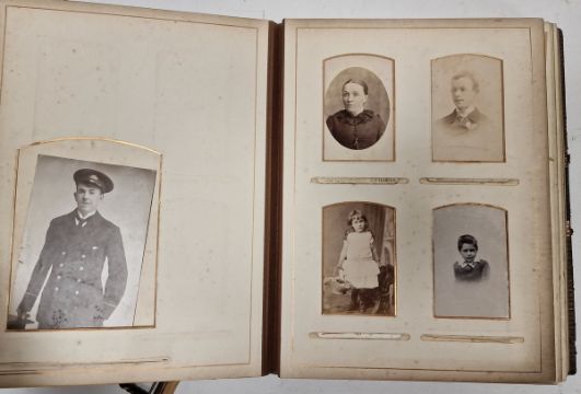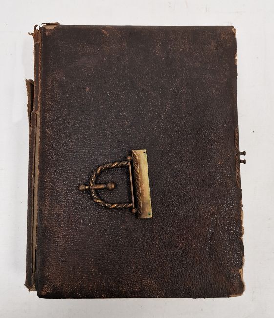 Late Victorian photograph album, mounted with family portraits alternating with pages printed with botanical specimens, within leather bindings and with gilt metal clasp