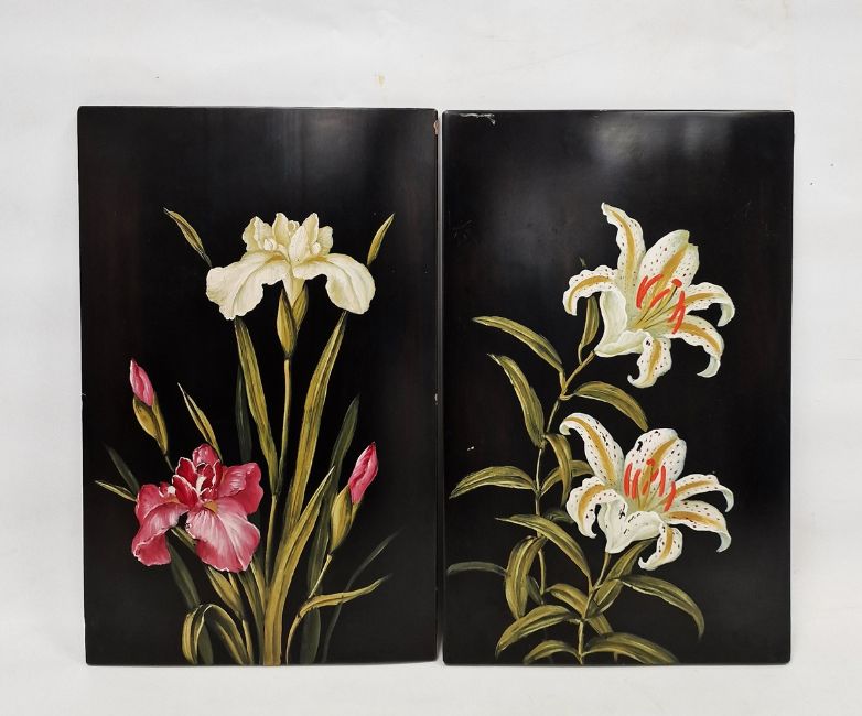 Two painted wooden rectangular panels, each painted in oil with lilies and orchids, 20th century, 28.5cm x 45.5cm (suspended for hanging)