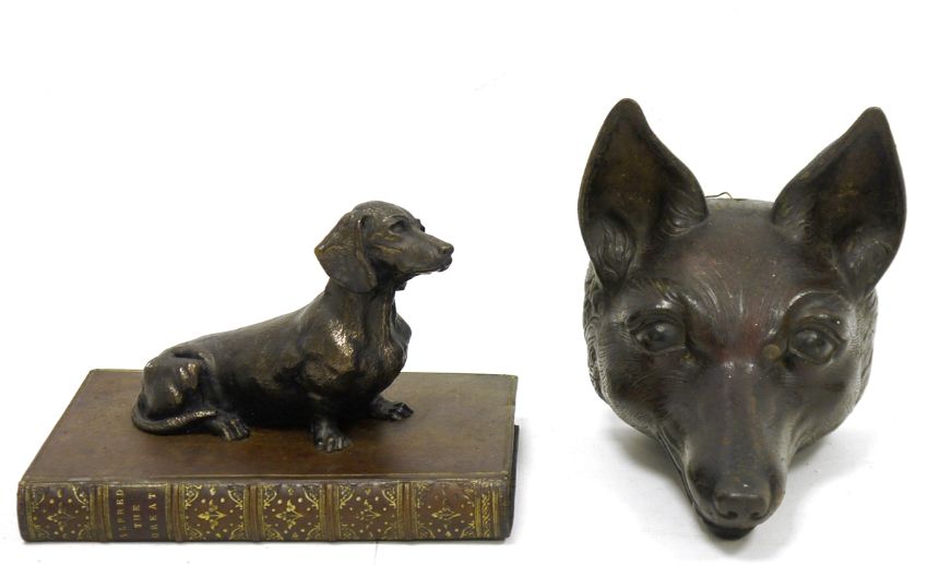Cast iron doorstop in the form of a fox head, probably late 19th century, 16.5cm long and a bronze-effect model of a dachshund on simulated leather resin model of a book, titled 'Alfred the Great', 20th century