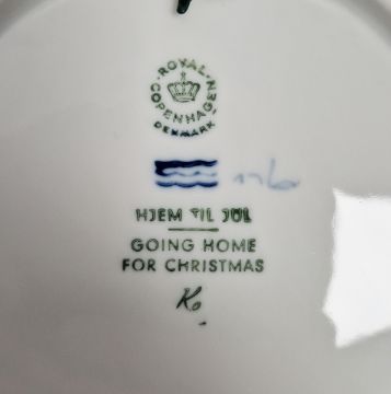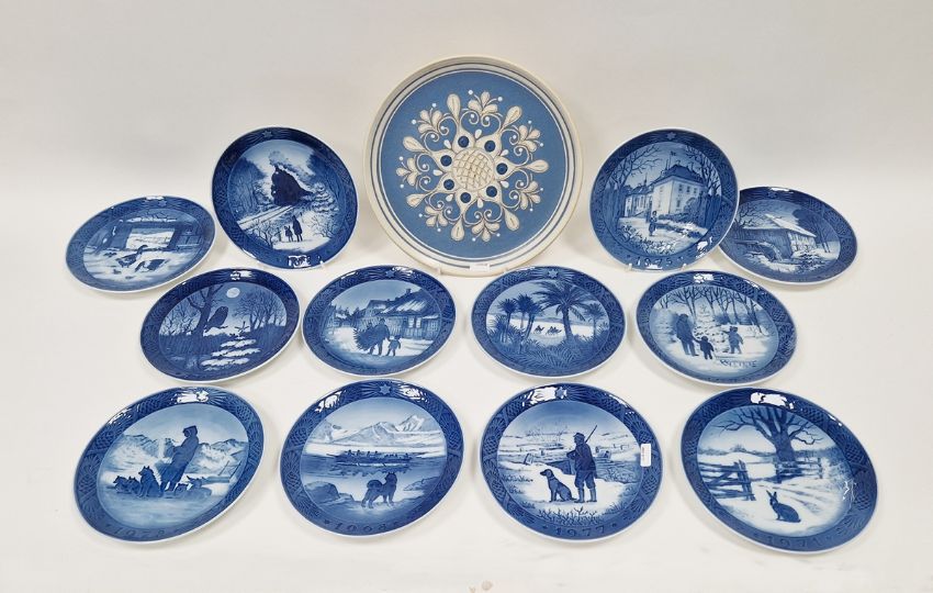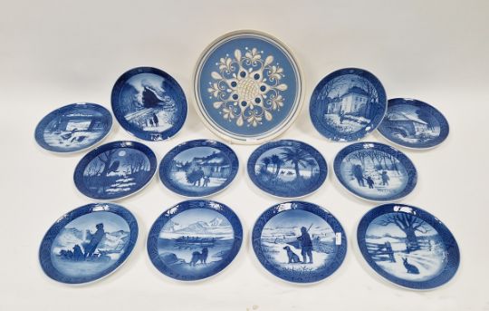Collection of Royal Copenhagen Christmas year plates, printed green factory marks, titled and with blue wave marks, most from the 1970s, 19cm diameter and a 20th century pottery dish with incised foliate medallion to centre, on blue ground (13)