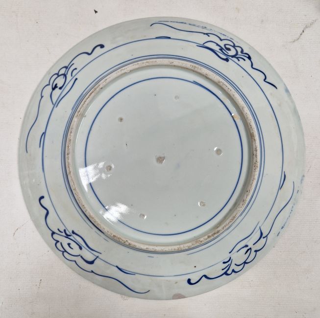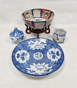 Japanese Imari fluted circular bowl, 19th century, painted with phoenix and crane within diaper-pattern panels, on wooden interlocking stand carved with characters, a blue and white circular dish printed with stylised prunus, a bottle-shaped vase painted with flowering shrubs, and a pierced hexagonal section planter, pierced with rice-pattern panels and painted with shrubs in blue and white (4)