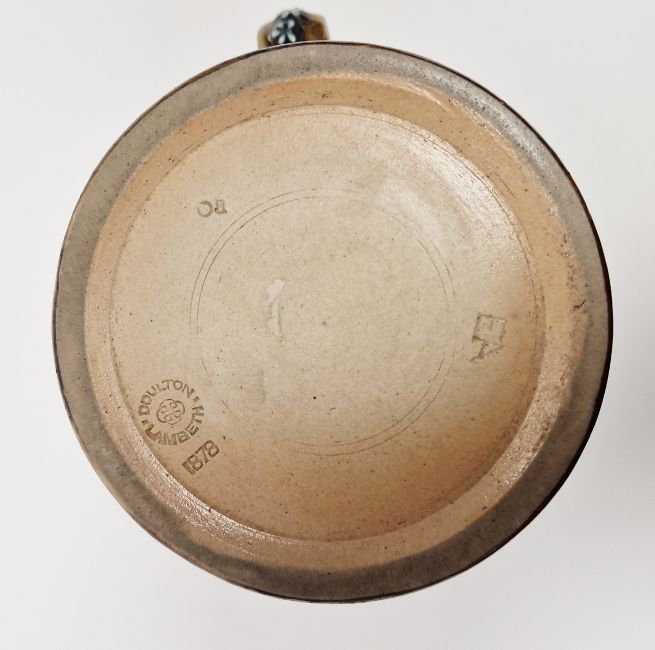 Doulton Lambeth silver-plated stoneware jug, late 19th century, impressed Doulton Lambeth 1878, RC marks, incised EA, with silver-plated rim, the body moulded with bands of lozenges and flowerheads, in blue and grey tones, above beaded foot rim, 17.5cm high