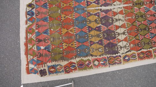 Kilim carpet fragments, woven with lozenge-shaped bands in green, red, blue and purple within vanilla borders, (damages and repair), 316cm x 160cm