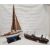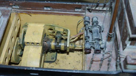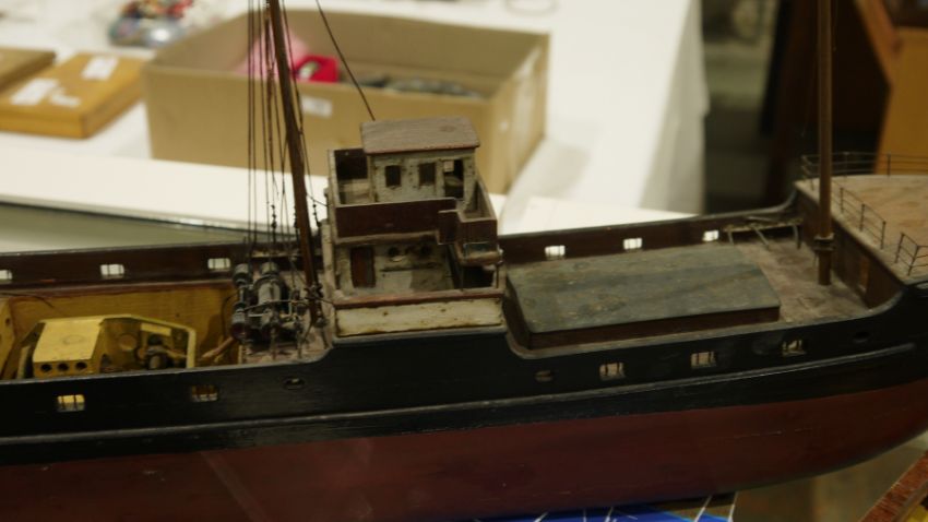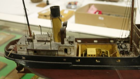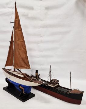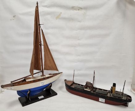 Mid-20th century pond yacht, with a blue painted hull, sails and rigging, on ebonised stand, 63cm wide, a vintage kit model of a steam trawler, motorised with red painted hull, 65cm long, a book on model steamers and motor boats and a pamphlet relating to a yacht design competition  Condition Report Request: What are the hull and fitting made of? What kind of motor?Model steamship - Wooden hull, predominately metal fittings. Electric motor, please see additional photos.