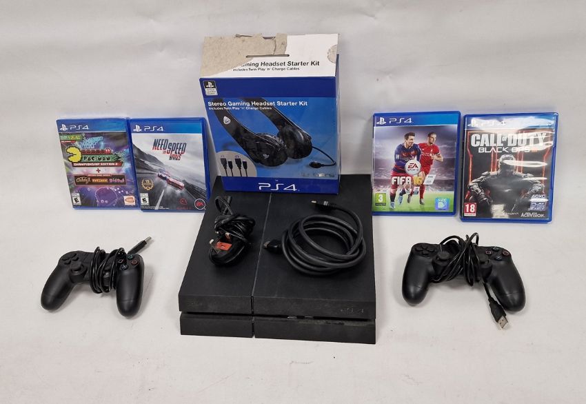 Sony PS4, with stereo gaming headset starter kit for games, two controllers and a small quantity postcards