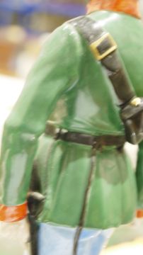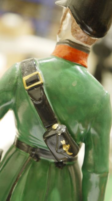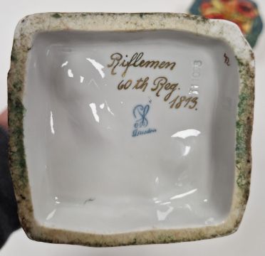 Dresden porcelain figure of a rifleman from the 60th Regiment, circa 1900, printed blue marks, titled 'Riflemen 60th Reg. 1813', impressed numerals, modelled standing wearing a green jacket, on grassy square base, 27cm high, and a Moorcroft-style lobed rectangular box and cover decorated with red flowers (2)  Condition Report Rifleman -Loss to hat. Some missed paint in places. Paint chipping to belt and back pouch. Some paint wear to base and imperfections in moulding around one foot. Some surface marking.Box - Some marks/residue to the interior. Some surface wear.