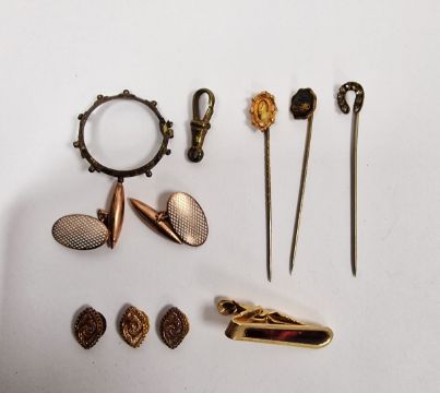 Three stickpins, cased, three gold-coloured metal collar studs, cased and two gold-coloured metal and enamel cufflinks, 4g approx.