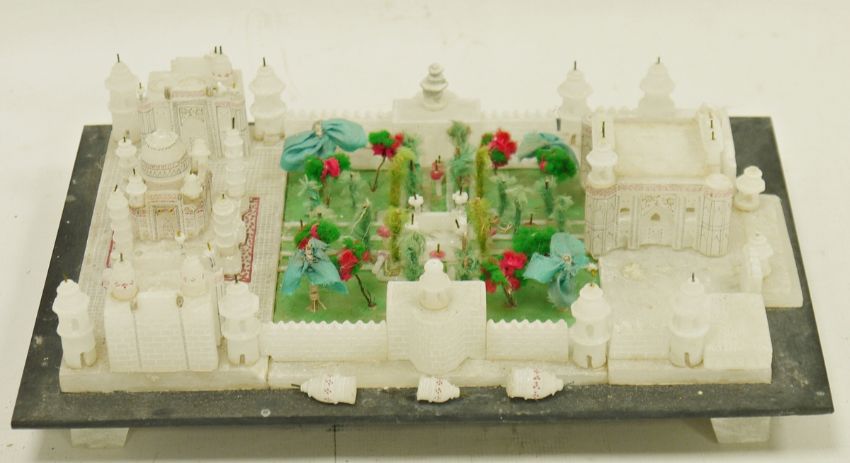 Vintage alabaster model of the Taj Mahal, the building centred by a fabric and wire garden, raised on slate stand, 18cm x 26.5cm