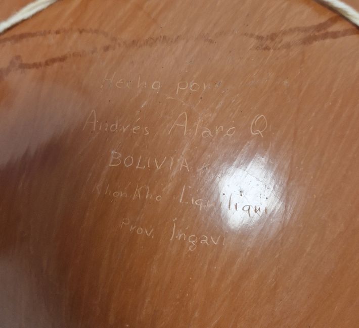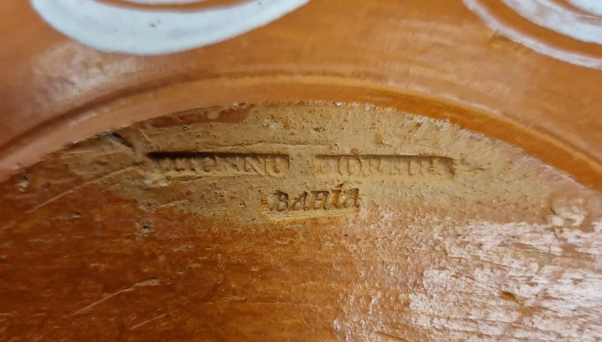 Collection of Brazilian (Bahia) redware, 20th century, comprising two stylised ox-formed pouring vessels (tallest 38cm) and a circular dish, each painted in white enamel with leafy flower sprays, the dish with impressed marks, and a Bolivian dish similar, painted with a geometric stylised figure, incised marks for Andres Alaro Q/ Bolivia, pierced for hanging (4)