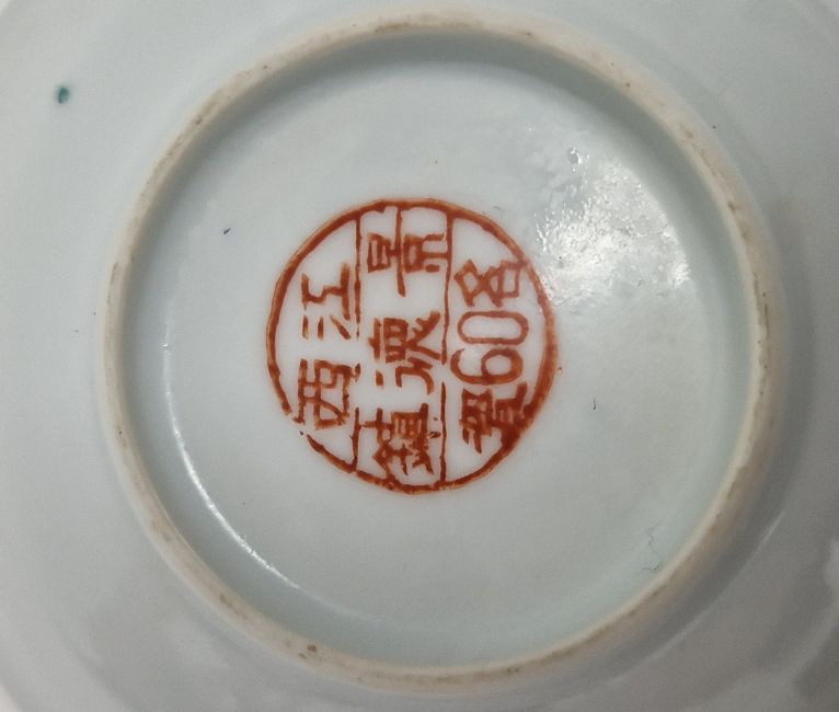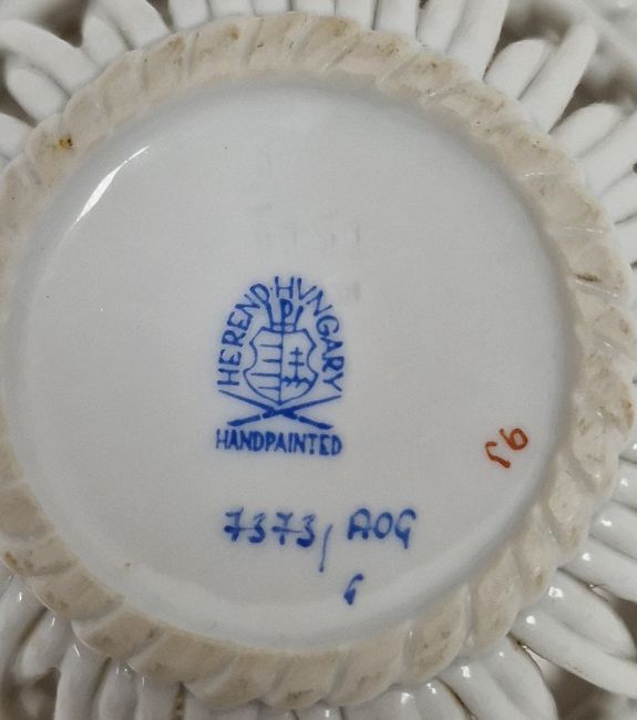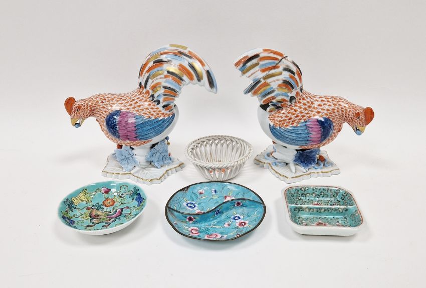 Pair of continental porcelain models of cockerels in the Herend-style (unmarked, perhaps seconds), each modelled on leaf-moulded bases, enriched in bright enamels (one cracked and repaired), 17.5cm high, a miniature Herend basket with orange flower sprays, printed blue factory marks, a Canton enamel two-section small dish, and two turquoise ground famille rose small dishes