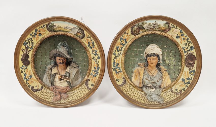 Pair of late 19th century Austrian (Johann Maresch) pottery chargers, impressed 5836, JMO marks, one moulded with an 17th century-style gentleman with violin, within musical trophy and landscape border vignettes, the other with a lady with playing cards, within a border of landscape vignettes and diaper pattern, enriched in matt colours, within gilt moulded rims, 45cm diameter