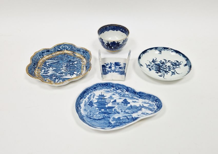 Worcester porcelain 'Mansfield' pattern saucer, circa 1775, blue crescent mark, a pearlware blue and white transfer-printed asparagus server, a Caughley blue and white transfer-printed tea bowl, an English porcelain lobed teapot stand, and a Miles Mason pearlware spoon rest
