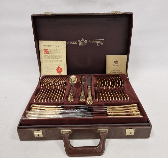 Set of German gold-plated table flatware for 12 persons, Bestecke, with ornate handles, in case