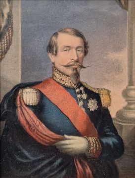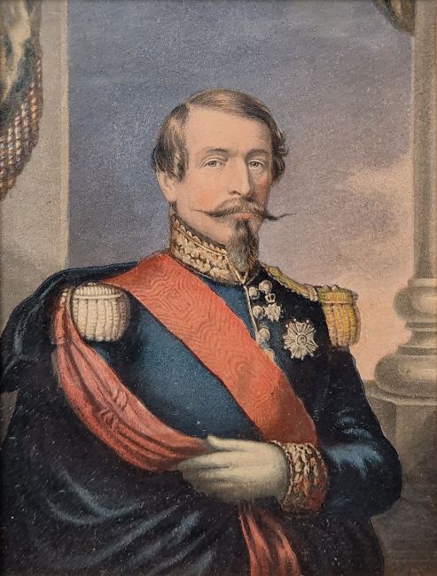 Pair colour prints Half-length portrait of princess and her consort, 11cm x 8cm, in birds eye maple frames  Two small engravings  "Waterloo Place, Register Office" and "Water Of Leith", both rosewood framed (4)